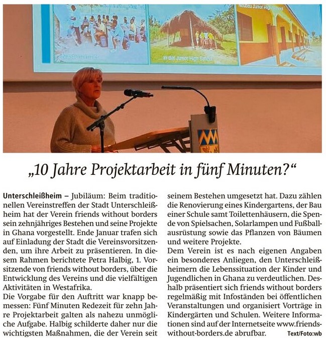 Ende Januar trafen sich Vereinsvorsitzende auf Einladung der Stadt Unterschleißheim zum traditionellen Vereinstreffen. In diesem Rahmen konnte Petra Halbig, 1. Vorsitzende von friends without borders, ihre Projekte in Ghana vorstellen.